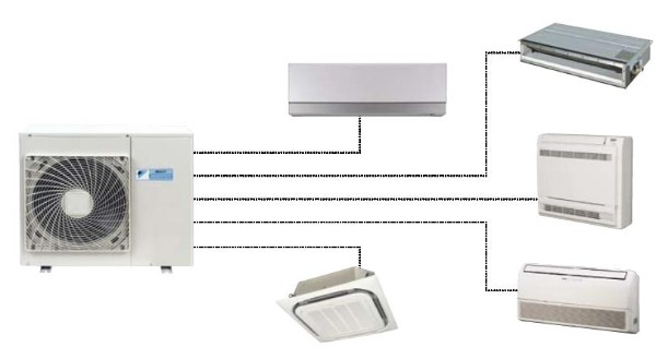 Die Lösung für bis zu 5 Räume. Die Multisplittechnik ist die Zwischenstufe von einem Split-Klimagerät und einem VRF VRV- Klimagerät. Eine preislich interessante Lösung, wenn Sie mehrere Räume klimatisieren wollen. Eine Geräteeinheit besteht aus einem Außen- und bis zu 5 Innengeräten. Dies ist abhängig von der benötigten Kälteleistung.