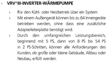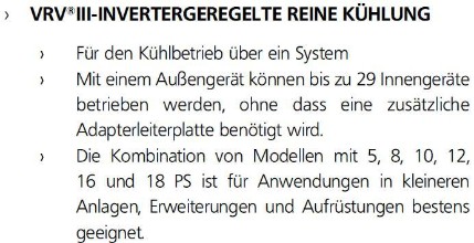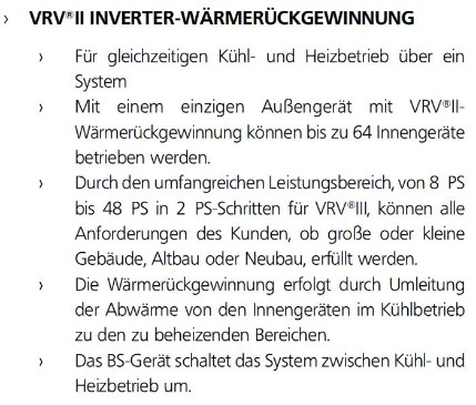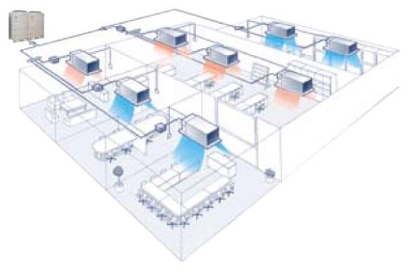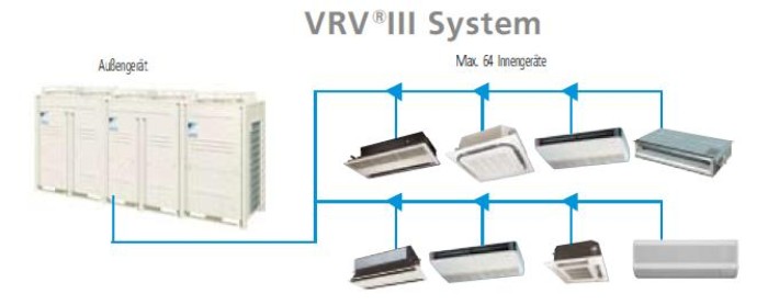 _________________________________________________________________________ Diese Geräte sind für die Kühlung und als Heizung von Gebäuden vorgesehen. Optimale Anwendungen sind Geschäfte wie z.B. Modegeschäfte oder größere Bürokomplexe wie z.B. von Banken- und Versicherungsgebäuden. Die Geräte sind modular aufgebaut und decken daher ein breites Spektrum ab. Durch ihre hohe Qualität ersetzen sie mühelos konventionelle Erdgas- und Öl- Zentralheizungsanlagen. Es können bis 64 Innengeräte angeschlossen werden.